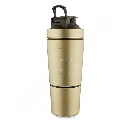 شیکر یکی از مهمترین و ضروری ترین ملزومات بدنسازی می باشد با تکان دادن آنها به راحتی می توان مکمل های ورزشی را برای قبل و بعد از تمرین آماده کرد. شیکر ورزشی مدل CY201 یک شیکر خاص و کاربردی از جنس استیل می باشد که بسیار بادوام، مقاوم در برابر ضربه، ضد بو و ضد زنگ است. استیل بودن آن، امکان استفاده از آن را برای نوشیدنی های گرم نیز فراهم می کند و تا حدی قابلیت حفظ دما را نیز دارد. ساختار این محصول به صورت دو تکه می باشد. دارای یک قسمت مجزا در بخش انتهایی بوده که به لطف آن میتوانید قرص، پودر و مکمل ها را با خود به همراه داشته باشید. از طرف دیگر از این بخش میتوانید به عنوان لیوان نیز استفاده کنید. از این شیکر علاوه بر باشگاه برای سفر و کمپینگ نیز قابل استفاده و مناسب است. این شیکر دارای یک گوی فنری است که نقش همزن و میکس کننده ی مکمل ها را درون مایعات به عهده دارد. محل خروج مایعات این محصول به صورت ضامنی باز و بسته می شود و با توجه به طراحی که دارد، کاملاً ضد نشتی می باشد و شما می توانید شیکر را با خیال راحت در ساک ورزشی خود حمل کنید و استفاده نمایید. بر روی بدنه ی شیکر ورزشی مدل CY201 شاهد درجه بندی هایی هستیم که کار با این شیکر را راحت تر و دقیق تر کرده است. درپوش پلاستیکی این قمقمه که به صورت پیچی باز و بسته می شود. نوع خروج آب و دهانهی لولهای، امکان نوشیدن آب را آسانتر کرده است. این محصول دارای ابعاد 9 × 18 سانتیمتر است و وزنی معادل 280 گرم دارد. گنجایش آن 591 سی سی است که کاملاً مناسب با نیازهای ورزشکاران حرفه ای می باشد.